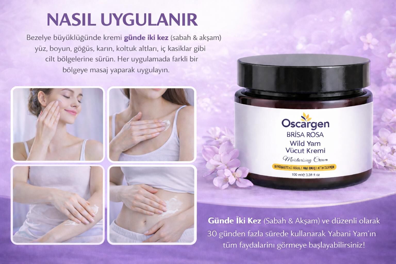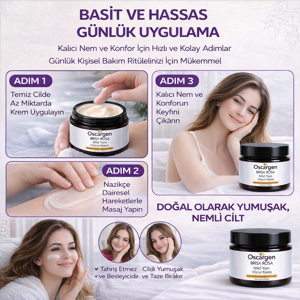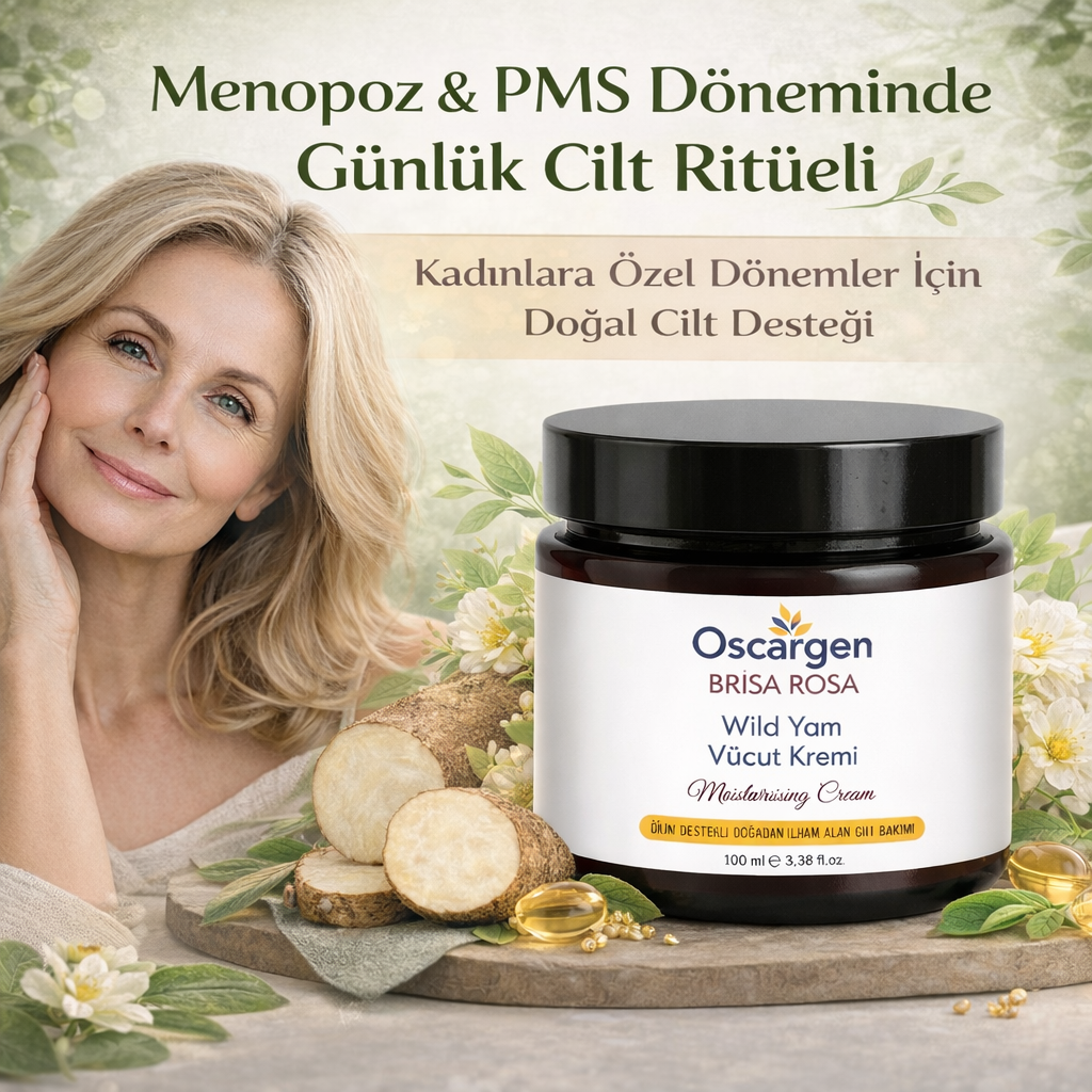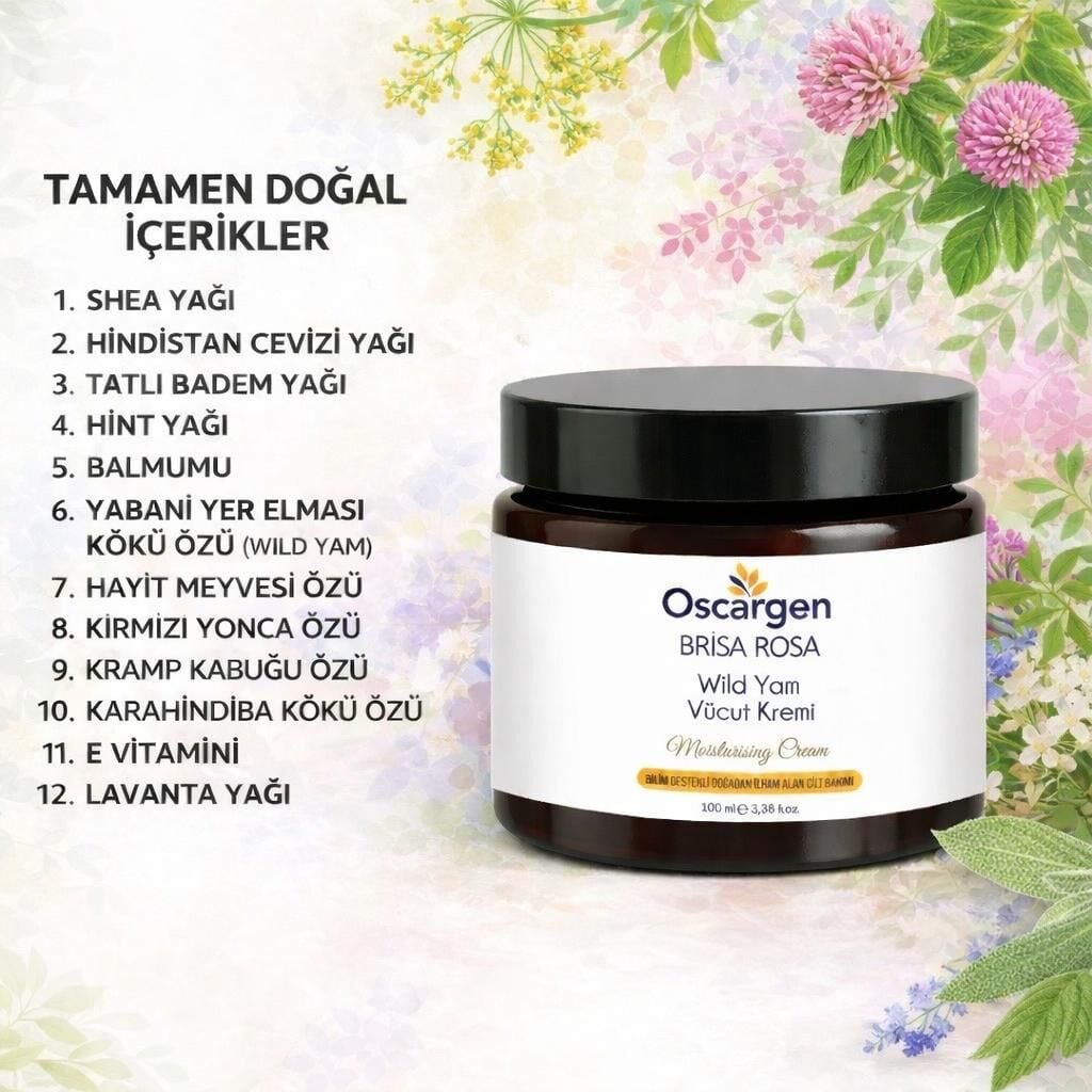 Oscargen Brisa Rosa Wild Yam Vücut Kremi, bu dönemlerde cildin ihtiyaç duyduğu bakımı desteklemek amacıyla, tamamen doğal içeriklerle formüle edilmiştir.