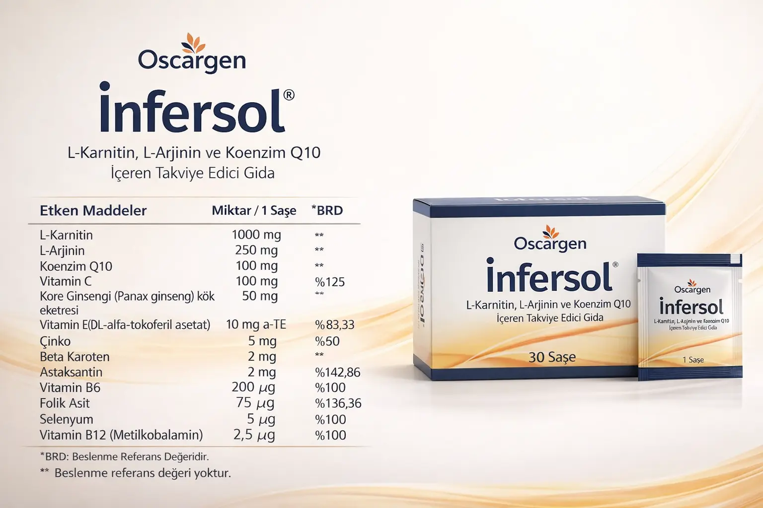 Infersol®, pratik kullanıma uygun formda hazırlanmış, 30 adet saşe içeren yeni nesil bir antioksidan kompleksidir. Formülüyle hem kadınlar hem de erkekler için bilimsel temelli olarak geliştirilmiştir.