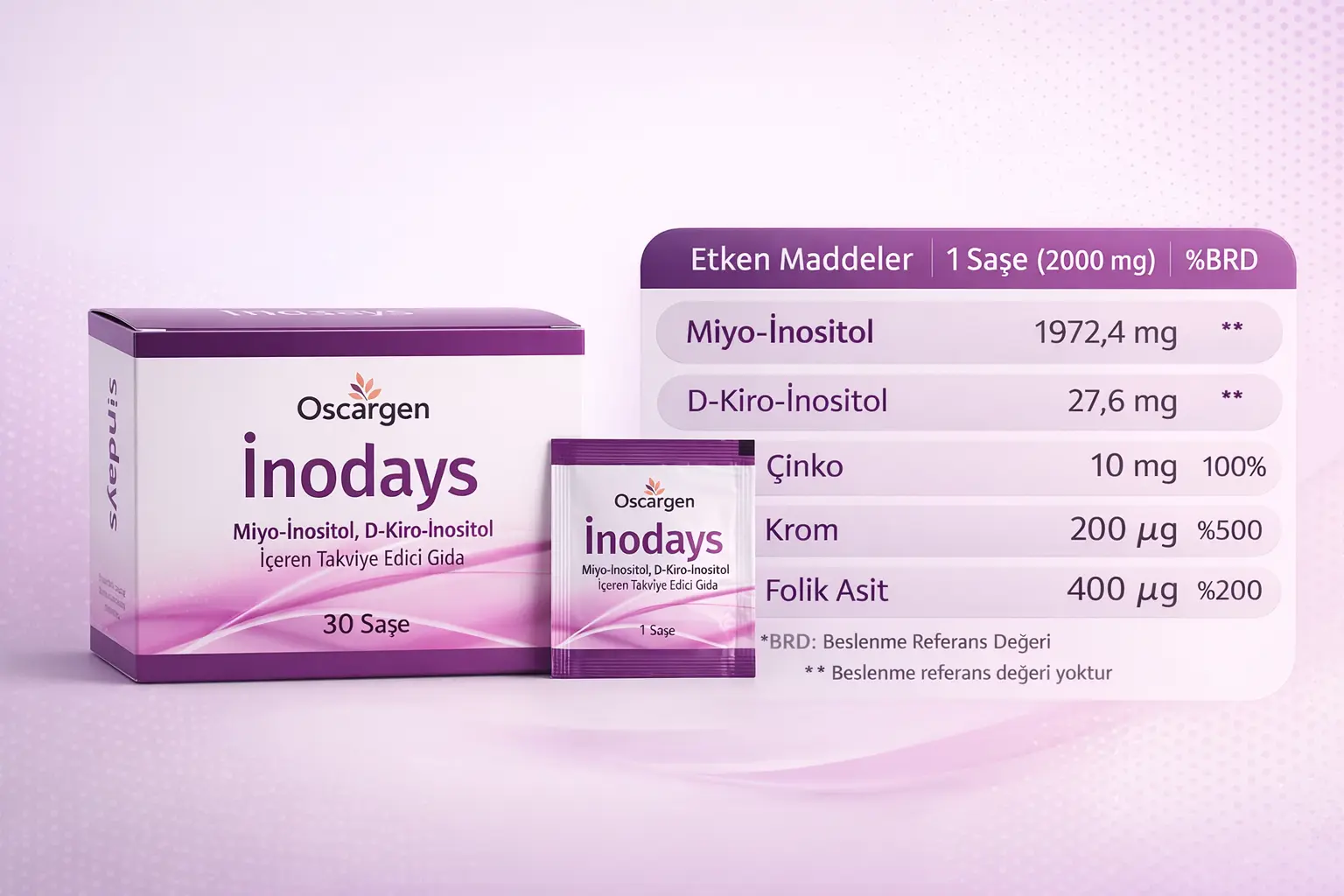 İnodays®, polikistik over sendromu (PCOS) yaşayan kadınların metabolik ve hormonal dengesini desteklemek amacıyla bütüncül bir yaklaşımla formüle edilmiştir. Her saşede yer alan 2000 mg inositol, vücudun insüline verdiği yanıtı destekleyerek insülin direncinin dengelenmesine ve buna bağlı hormonal düzensizliklerin kontrol altına alınmasına yardımcı olmayı hedeflerken, ovulasyon sürecinin desteklenmesine katkı sağlayabilir. Formülde bulunan 200 mikrogram krom, insülinin etkinliğini destekleyerek kan şekeri metabolizmasının korunmasına ve iştah kontrolüne yardımcı olur. 10 mg çinko, hormon metabolizmasında rol oynayan önemli bir mineraldir; PCOS’ta zaman zaman görülebilen çinko eksikliğinin desteklenmesi, saç dökülmesi ve istenmeyen tüylenme gibi belirtilerin yönetiminde destekleyici olabilir. 400 mikrogram folik asit ise hücre yenilenmesi ve DNA sentezi süreçlerinde görev alarak üreme sağlığının korunmasına katkıda bulunur. Bu özel kombinasyon sayesinde İnodays ®, yalnızca tek bir semptoma değil; metabolik denge, hormonal düzen ve hücresel destek mekanizmalarını birlikte ele alan kapsamlı bir destek ürünü olarak planlanmıştır. Ayrıca günde 1 kez kullanılması ile kullanım kolaylığı sağlamaktadır. 1 kutu inodays aylık kullanım için yeterlidir.