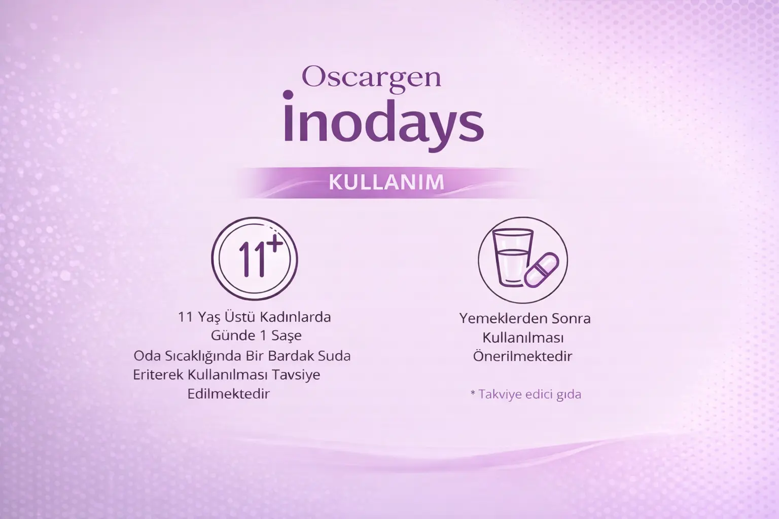 Inodays®, pratik kullanım sunan tek servislik saşeler halinde formüle edilmiş, tatsız ve kokusuz toz formda bir gıda takviyesidir. Her kutu, bir aylık kullanım için tasarlanmış 30 adet saşe içermektedir. Gazsız olmak koşuluyla su veya tercih edilen başka bir içecek ile karıştırılarak tüketilebilir.